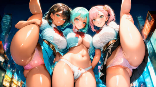 2girls, 15yo, cheaky bitch, (standing split:1.3), (front split:1.5), (high front kicking:1.2), (legs over body:1.5), (one leg up:1.1), finely detailed beautiful eyes and detailed face, Urban fashion, Denim jacket, Scarf, minii skirt, huge breasts, (shiny skin:1.2), fair skin, (dark skin:1.3), covered erectile nipples, various hair, straight perm hair, hair ornament, thighhighs, naughty face, closed mouth, fun, looking at viewer, city, morning, (Iridescent Highlights), dynamic angle, (from directly below:1.2), cinematic lighting, (score_9, score_8_up, score_7_up, score_6_up, score_5_up, score_4_up, source_anime, masterpiece, amazing quality, best quality, detailed, absurdres, an extremely delicate and beautiful, intricate, uef:1.3), High saturation BREAK light purple Satin panties, cobalt blue Sheer panties, (close up panties, foreshortening:1.3), cameltoe Negative prompt: (worst quality, low quality:1.4), (unaestheticXL2v10:1.3), cropped screen, bad anatomy, bad proportions, extra legs, deformed anatomy, deformed fingers, bad, distracted, hyperrealistic,source_furry, source_pony, source_cartoon, (realistic lips:1.3), (realistic nose:1.3), by bad-artist, (bad clothing:1.3), (undetailed clothing:1.3), (nonsensical backrounds:1.2), (bad backrounds:1.2), (bad shadows:1.2), (white background, simple background:1.7), crowd, Steps: 35, Sampler: Euler a, CFG scale: 7, Seed: 91124506, Size: 1280x720, Model hash: 3c33e4d504, Model: ebara_pony_1, VAE hash: 235745af8d, VAE: xlVAEC_f1.safetensors, Denoising strength: 0.48, Clip skip: 2, ENSD: 31337, ADetailer model: face_yolov8n.pt, ADetailer confidence: 0.3, ADetailer dilate erode: 4, ADetailer mask blur: 4, ADetailer denoising strength: 0.4, ADetailer inpaint only masked: True, ADetailer inpaint padding: 32, ADetailer version: 24.4.0, FreeU Stages: "[{"backbone_factor": 1.2, "skip_factor": 0.9}, {"backbone_factor": 1.4, "skip_factor": 0.2}]", FreeU Schedule: "0.4857142857142857, 1.0, 0.0", FreeU Version: 2, Hires upscale: 1.8, Hires steps: 20, Hires upscaler: R-ESRGAN 4x+ Anime6B, Lora hashes: "ebarahsk_v01-06: 787978f4b0f1", Version: f0.0.17v1.8.0rc-latest-276-g29be1da7