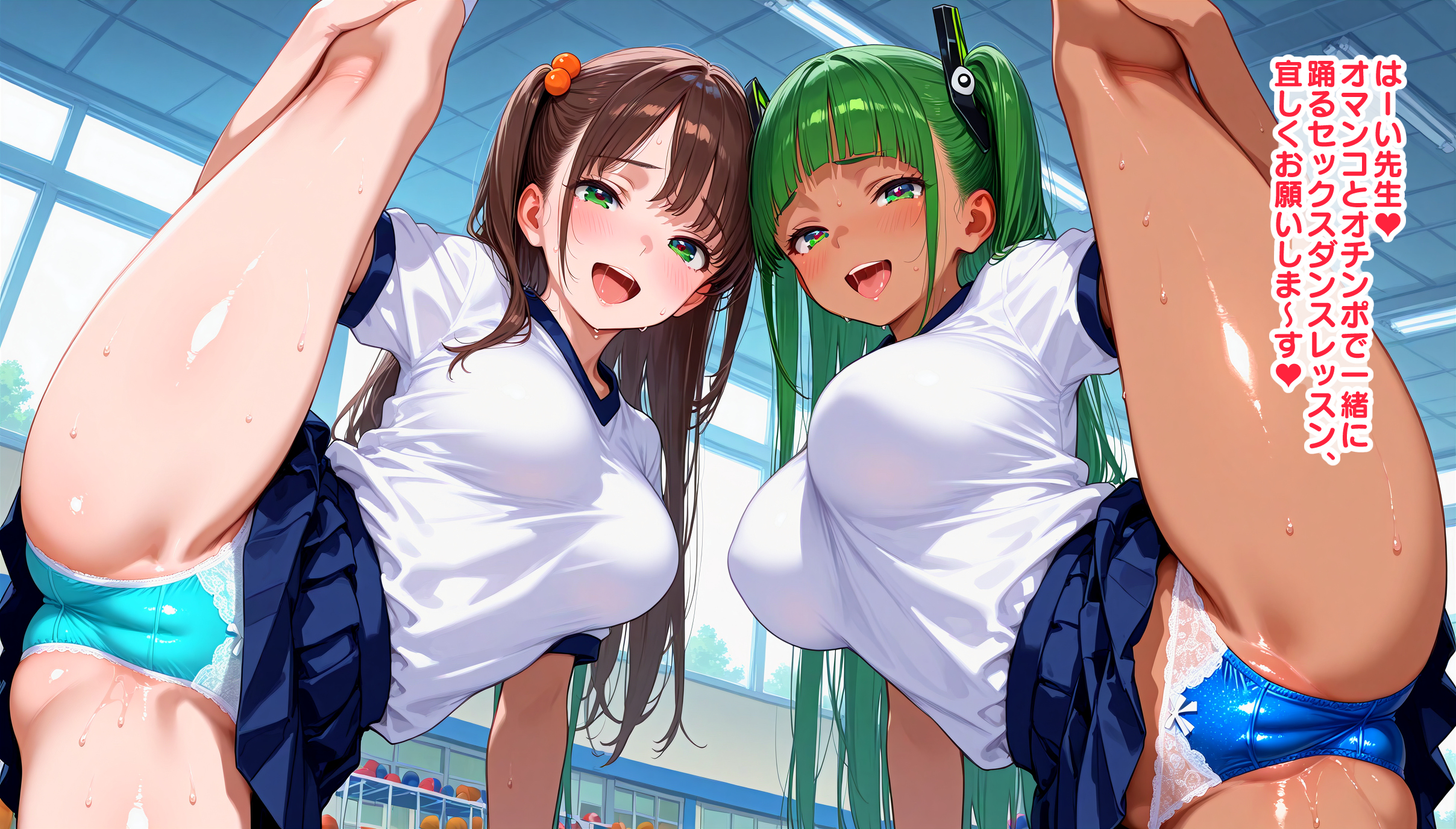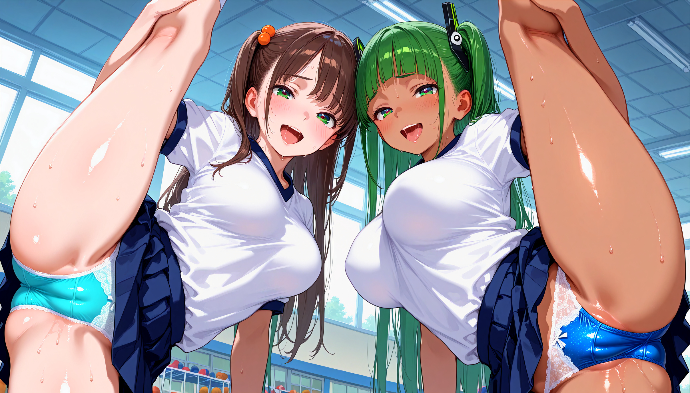 2girls, 15yo, cheaky bitch, (standing split:1.3), (front split:1.5), (high front kicking:1.2), (legs over body:1.5), (one leg up:1.1), finely detailed beautiful eyes and detailed face, Urban fashion, Denim jacket, Scarf, minii skirt, huge breasts, (shiny skin:1.2), fair skin, (dark skin:1.3), covered erectile nipples, various hair, straight perm hair, hair ornament, thighhighs, naughty face, closed mouth, fun, looking at viewer, city, morning, (Iridescent Highlights), dynamic angle, (from directly below:1.2), cinematic lighting, (score_9, score_8_up, score_7_up, score_6_up, score_5_up, score_4_up, source_anime, masterpiece, amazing quality, best quality, detailed, absurdres, an extremely delicate and beautiful, intricate, uef:1.3), High saturation BREAK light purple Satin panties, cobalt blue Sheer panties, (close up panties, foreshortening:1.3), cameltoe Negative prompt: (worst quality, low quality:1.4), (unaestheticXL2v10:1.3), cropped screen, bad anatomy, bad proportions, extra legs, deformed anatomy, deformed fingers, bad, distracted, hyperrealistic,source_furry, source_pony, source_cartoon, (realistic lips:1.3), (realistic nose:1.3), by bad-artist, (bad clothing:1.3), (undetailed clothing:1.3), (nonsensical backrounds:1.2), (bad backrounds:1.2), (bad shadows:1.2), (white background, simple background:1.7), crowd, Steps: 35, Sampler: Euler a, CFG scale: 7, Seed: 91124506, Size: 1280x720, Model hash: 3c33e4d504, Model: ebara_pony_1, VAE hash: 235745af8d, VAE: xlVAEC_f1.safetensors, Denoising strength: 0.48, Clip skip: 2, ENSD: 31337, ADetailer model: face_yolov8n.pt, ADetailer confidence: 0.3, ADetailer dilate erode: 4, ADetailer mask blur: 4, ADetailer denoising strength: 0.4, ADetailer inpaint only masked: True, ADetailer inpaint padding: 32, ADetailer version: 24.4.0, FreeU Stages: "[{"backbone_factor": 1.2, "skip_factor": 0.9}, {"backbone_factor": 1.4, "skip_factor": 0.2}]", FreeU Schedule: "0.4857142857142857, 1.0, 0.0", FreeU Version: 2, Hires upscale: 1.8, Hires steps: 20, Hires upscaler: R-ESRGAN 4x+ Anime6B, Lora hashes: "ebarahsk_v01-06: 787978f4b0f1", Version: f0.0.17v1.8.0rc-latest-276-g29be1da7