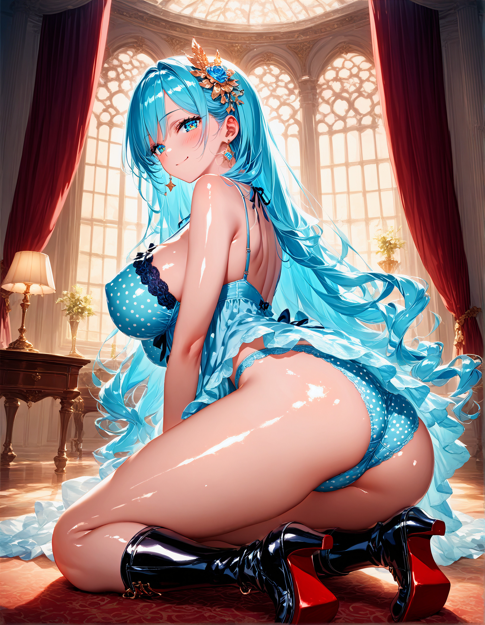 , looking at viewer, bedroom, bedroom, dynamic angle, (from back:1.2), morning