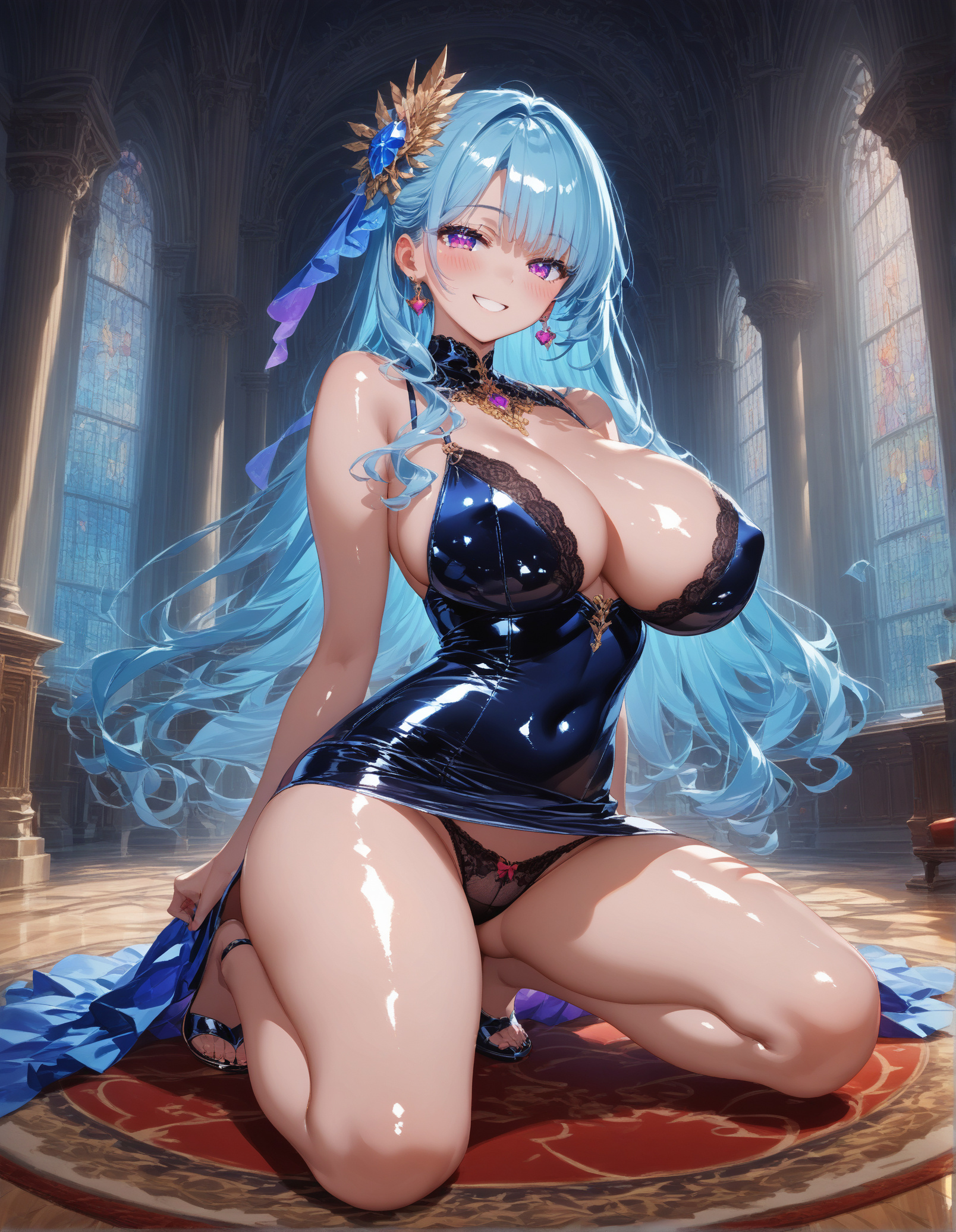 , (Transparent sexy Negligee:1.2), Sketchy negligee, large breasts, shiny skin, fair skin, (dark skin), various hair, braid, straight hair, hair ornament, thighhighs, ahegao, ahegao, torogao