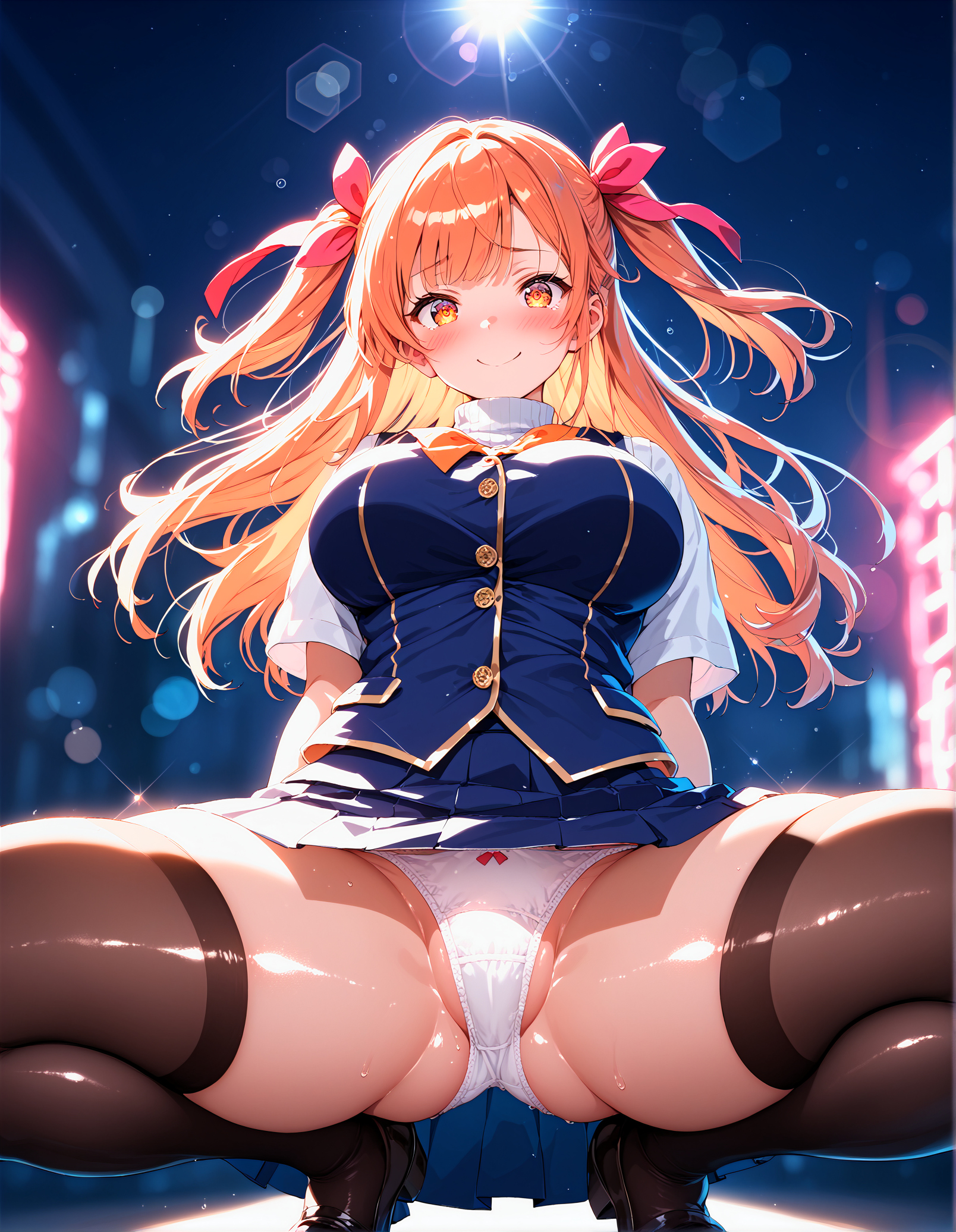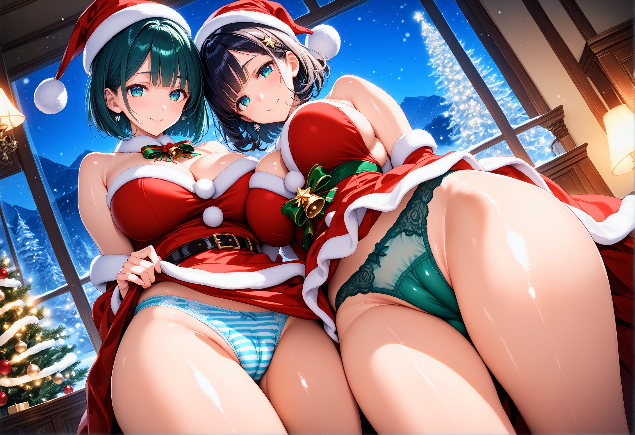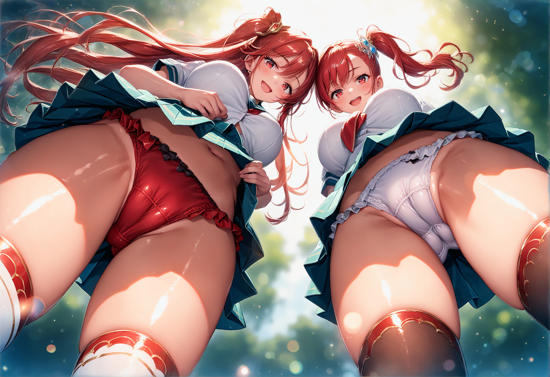 ![2girls kneeling, 15yo, cheaky bitch, (large ass, spread legs), finely detailed beautiful eyes and detailed face, (full body:0.4), Urban Outfit, Scarf, Blouse, skirt, large breasts, ,, fair skin, (dark skin), various hair, wavy hair, flipped hair, hair ornament, thighhighs, kind smile, smirk, torogao