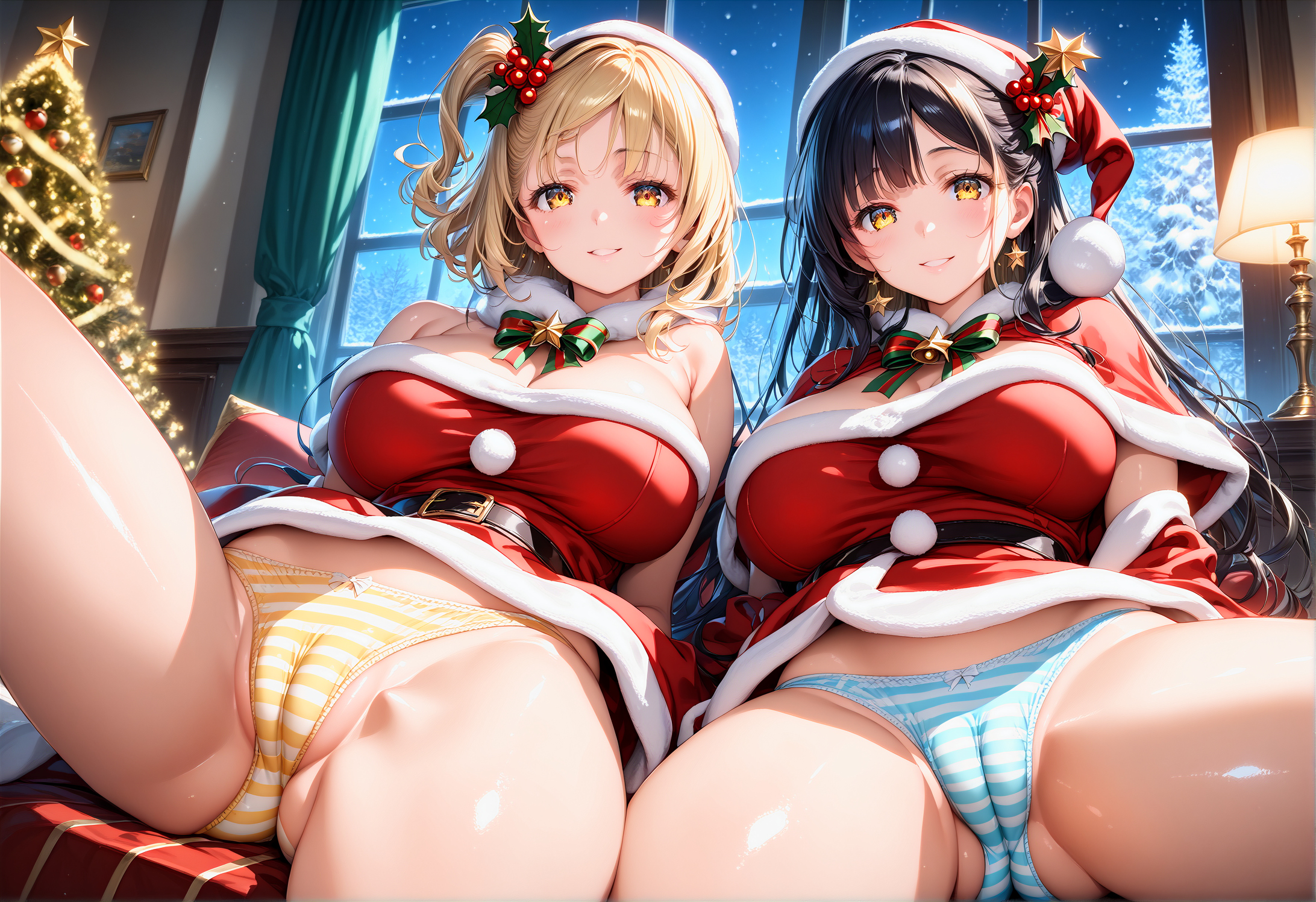 (2girls are layered vertically:1.1), 15yo, cheaky bitch, (large ass, spread legs), finely detailed beautiful eyes and detailed face, (full body:0.4)