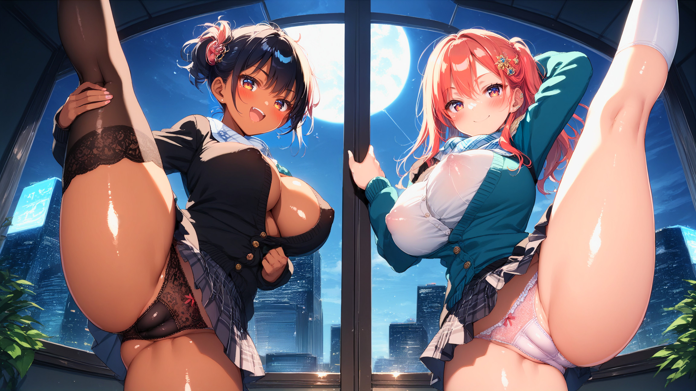 ![2girls, 15yo, cheaky bitch, (standing split:1.3), (front split:1.5), (high front kicking:1.2), (legs over body:1.5), (one leg up:1.1), finely detailed beautiful eyes and detailed face, Urban fashion, Denim jacket, Scarf, minii skirt, huge breasts, (shiny skin:1.2), fair skin, (dark skin:1.3), covered erectile nipples, various hair, straight perm hair, hair ornament, thighhighs, naughty face, closed mouth, fun, looking at viewer, city, morning, (Iridescent Highlights), dynamic angle, (from directly below:1.2), cinematic lighting, (score_9, score_8_up, score_7_up, score_6_up, score_5_up, score_4_up, source_anime, masterpiece, amazing quality, best quality, detailed, absurdres, an extremely delicate and beautiful, intricate, uef:1.3), High saturation