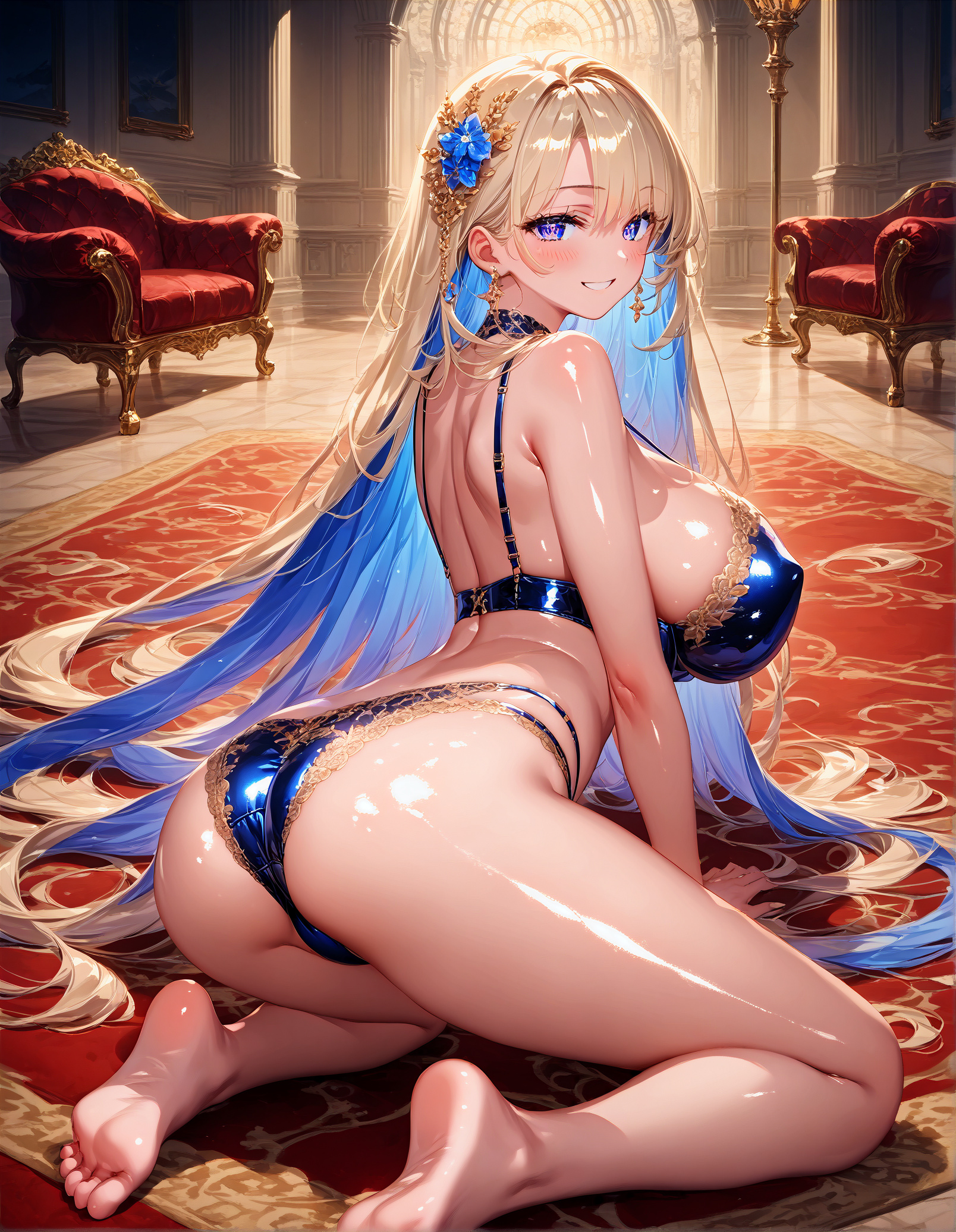, (Transparent sexy Negligee:1.2), Sketchy negligee, large breasts, shiny skin, fair skin, (dark skin), various hair, two side up, asymmetrical hair, hair ornament, thighhighs, seductive smile, torogao, torogao